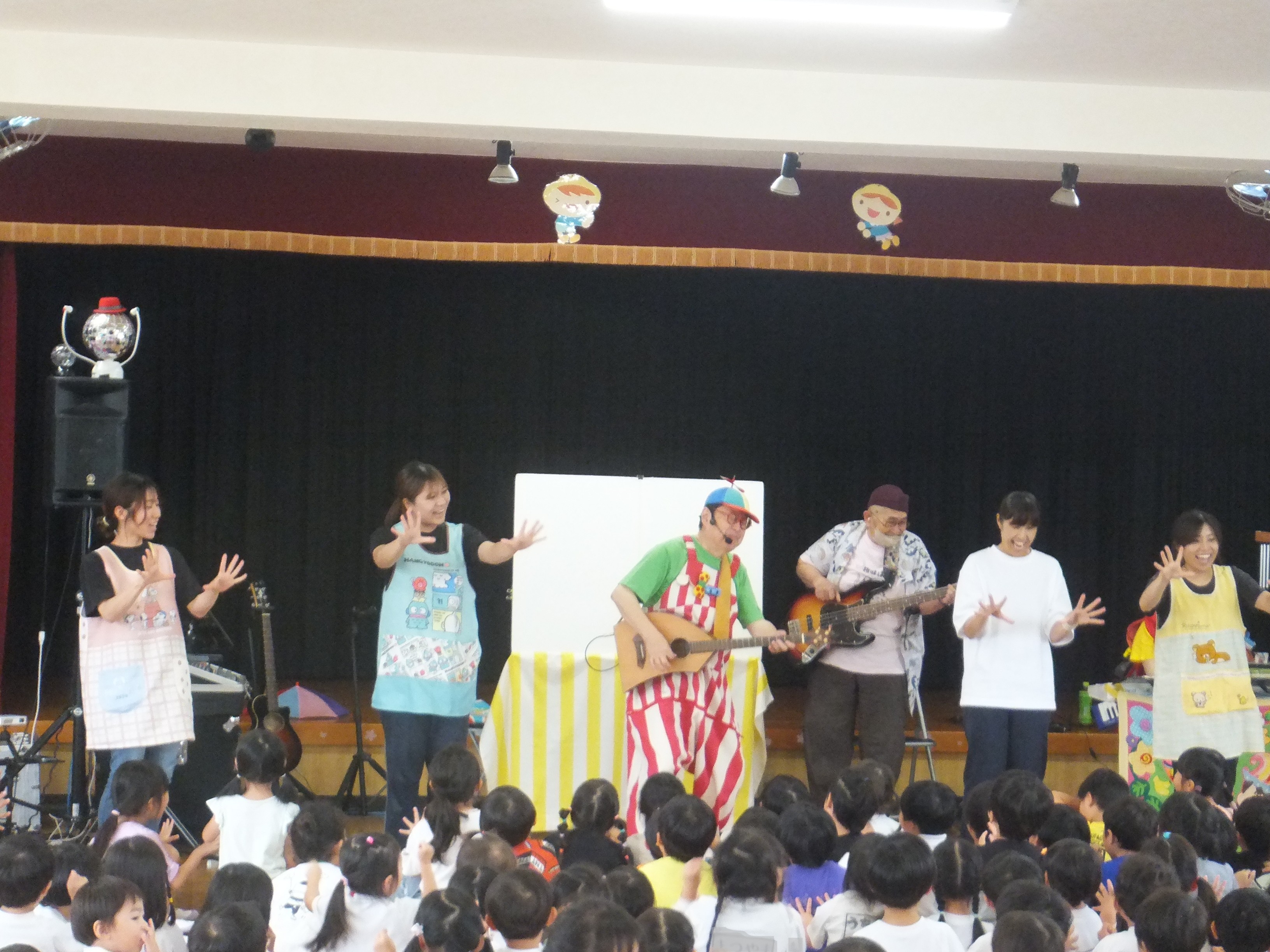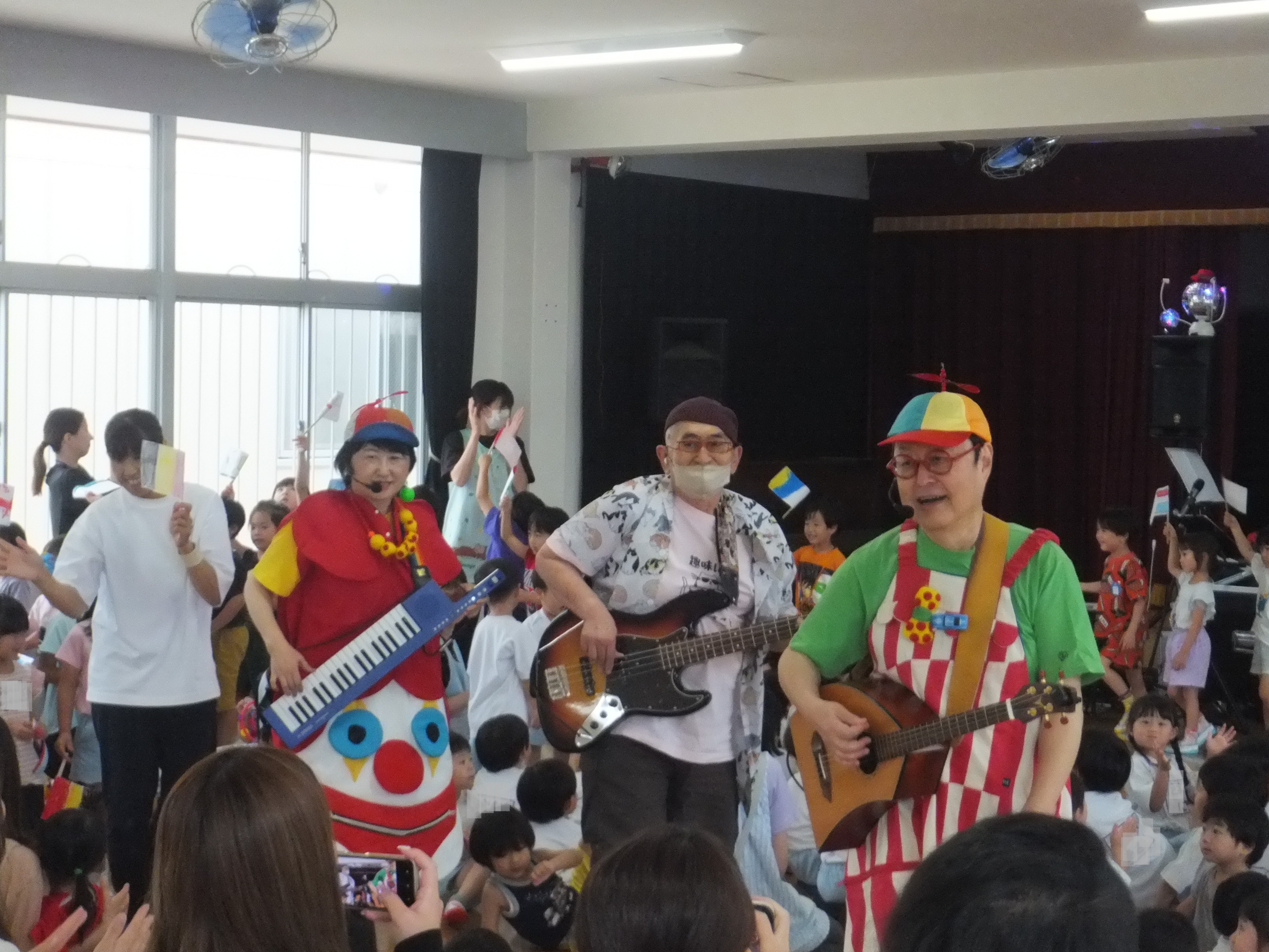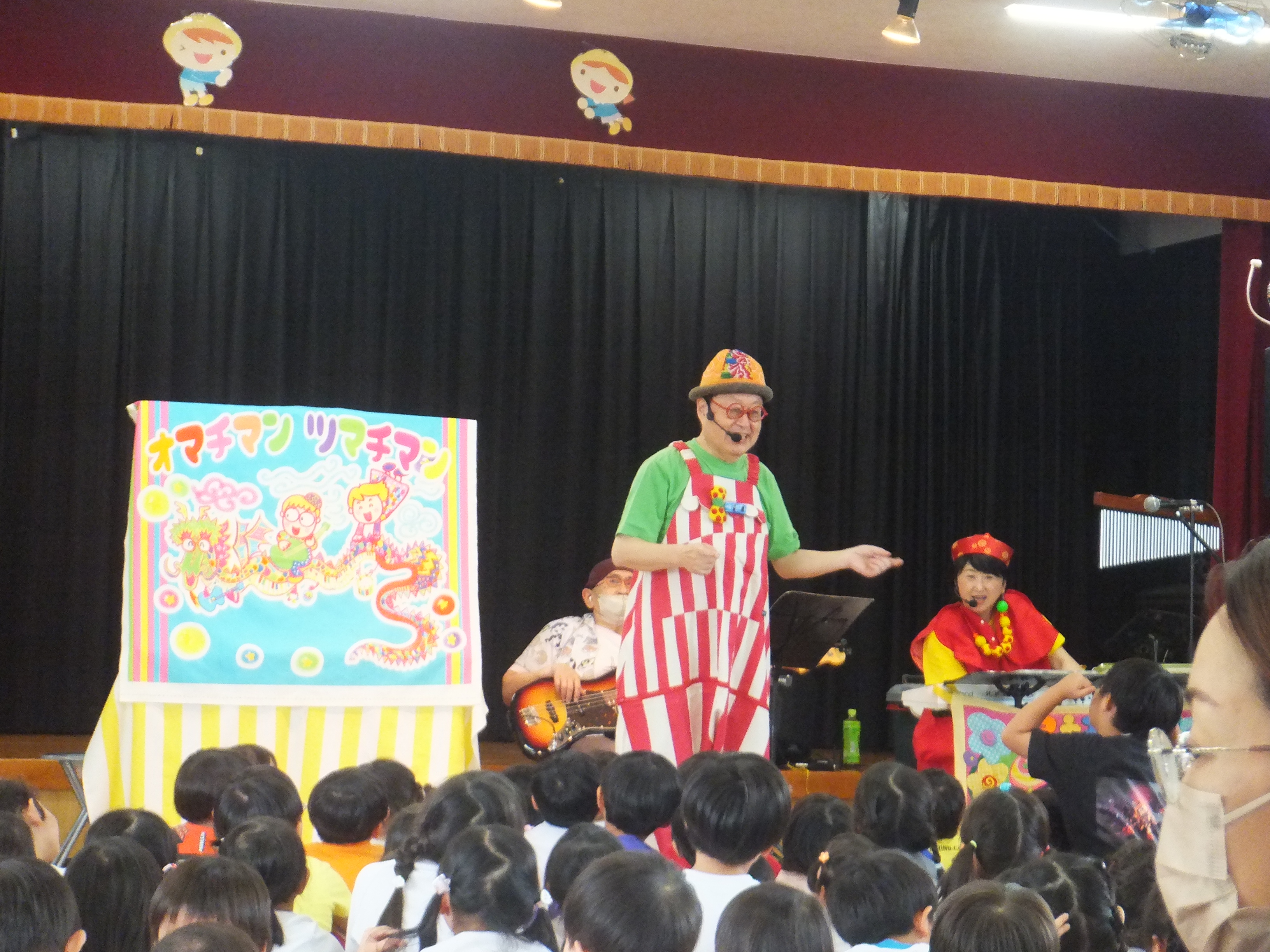 梅雨真っただ中の6月23日(月)、2年ぶりとなる「オマチマンコンサート」がおゆうぎ室にて行われました。初めての子たちもいて、みんな始まる前からウキウキワクワクでした。「オマチマン、ツマチマン」の自己紹介とともに、「ギショウマン」もステージに。「誰かわかる~?」の質問には、ちょっと自信なさげに「園長先生?」と答えたお友達。そう、いつものお坊さんの格好とは違ったので、少しわかりにくかったようですが、園長先生は趣味のベースを持って参加していました。