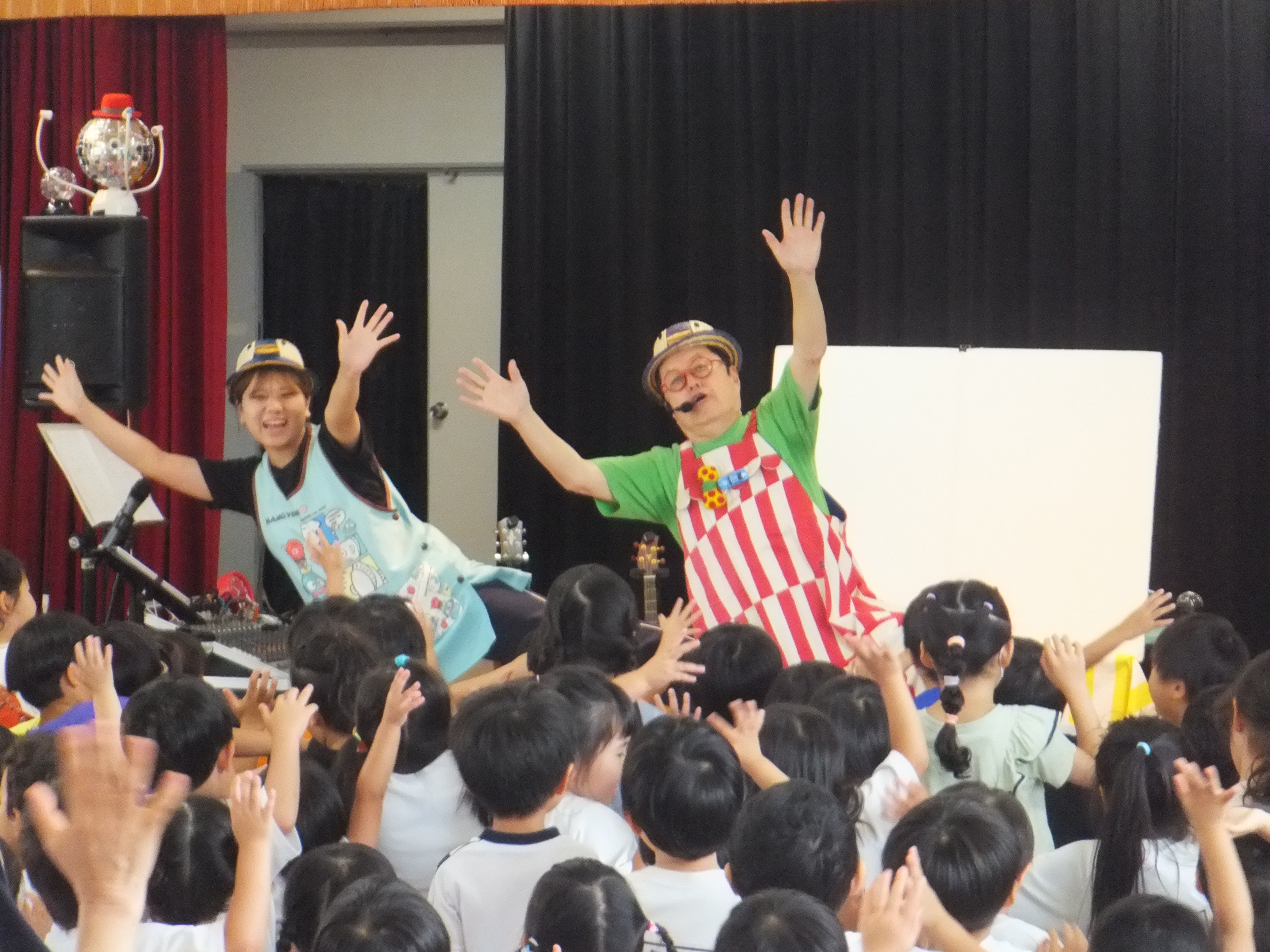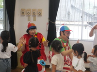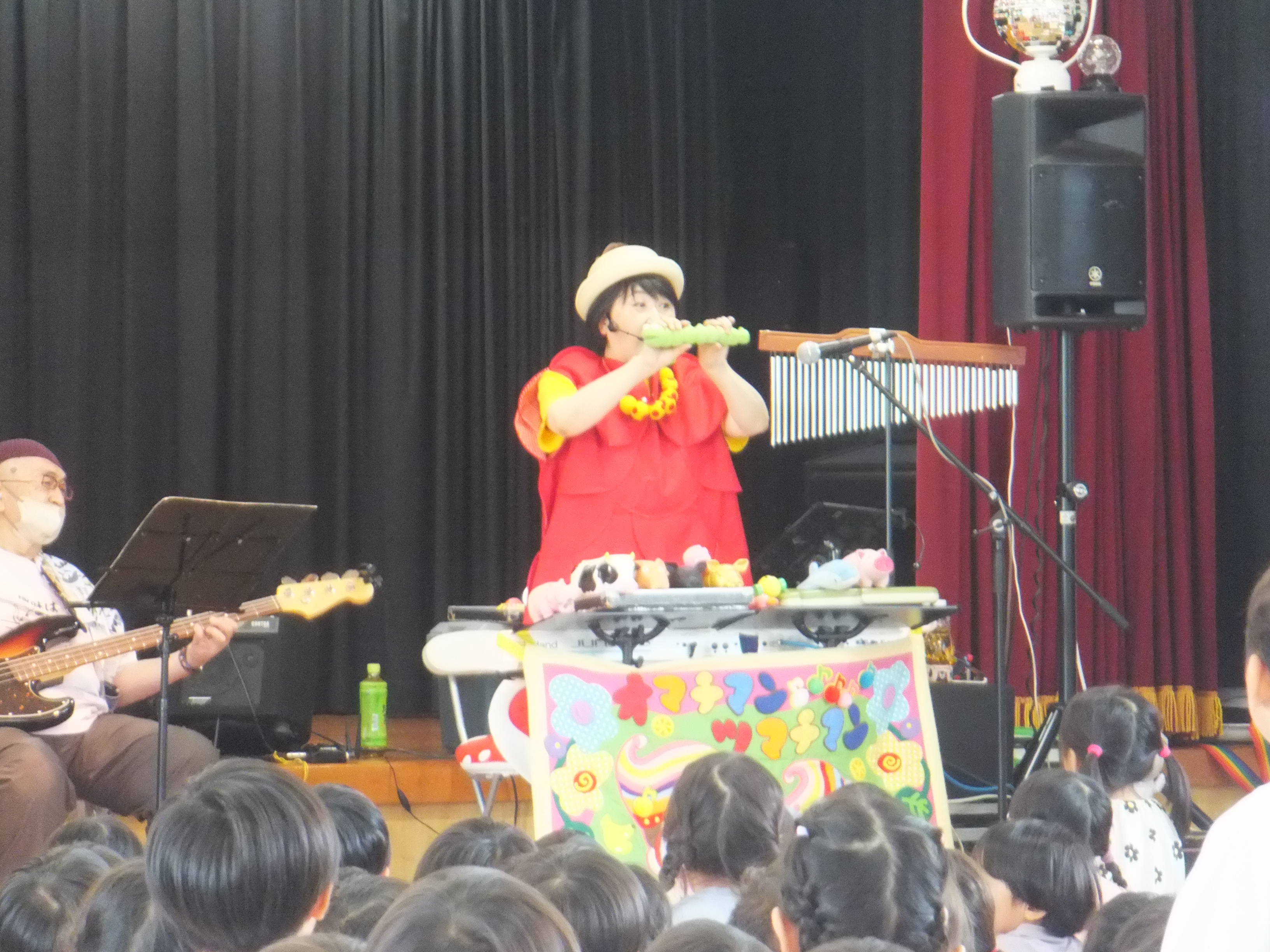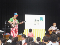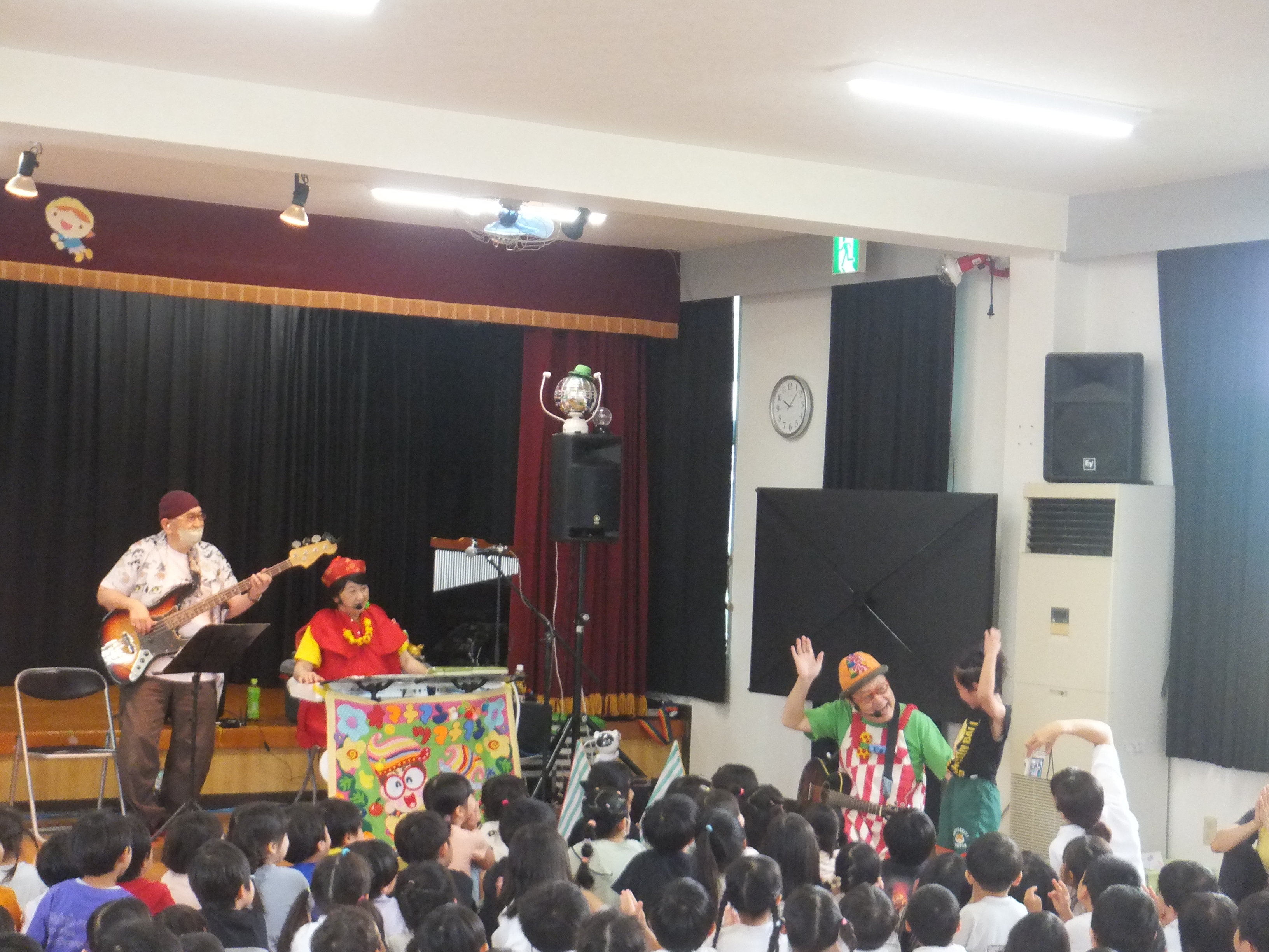 梅雨真っただ中の6月23日(月)、2年ぶりとなる「オマチマンコンサート」がおゆうぎ室にて行われました。初めての子たちもいて、みんな始まる前からウキウキワクワクでした。「オマチマン、ツマチマン」の自己紹介とともに、「ギショウマン」もステージに。「誰かわかる~?」の質問には、ちょっと自信なさげに「園長先生?」と答えたお友達。そう、いつものお坊さんの格好とは違ったので、少しわかりにくかったようですが、園長先生は趣味のベースを持って参加していました。