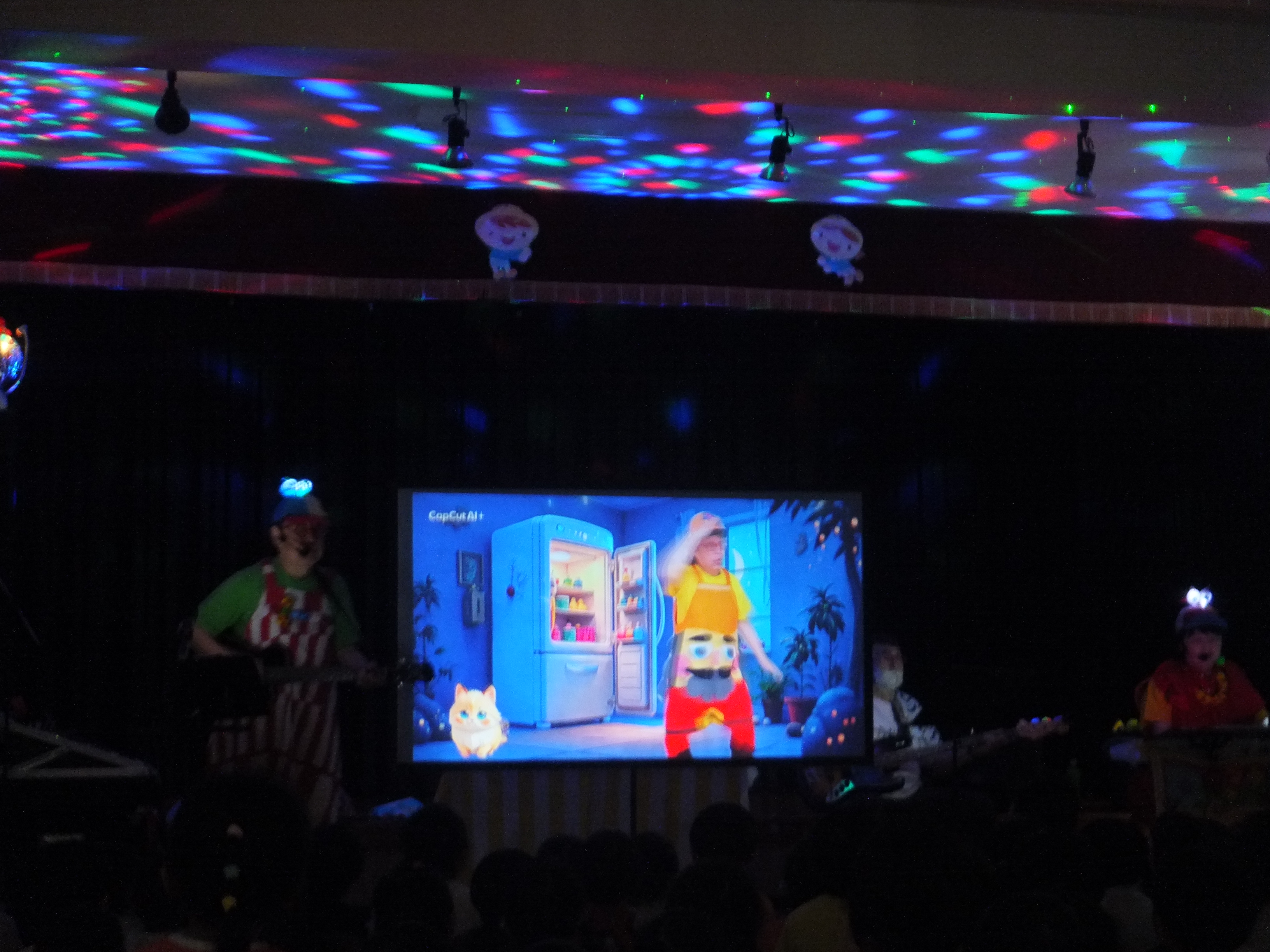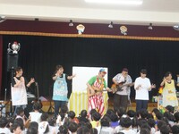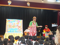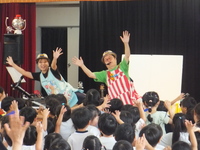 オープニングはお名前呼びの歌からです。「大好きな、君の名前を~、メロディに乗せて、1,2,3!」調子のいい歌に合わせてお返事も元気に「はーい!」と返ってきました。そのあとは、パネルシアターを使ったり、暗くしてプロジェクターを使ったりと、歌だけでなく視覚的にも楽しめました。0,1歳児の子ども達も調子の良いリズムに体を揺らしながら音楽を楽しんでいて、ラストの「世界中の子どもたちが」では、年長さんが描いた国旗の旗を持って会場を歩いて回りました。また、見に来ていたお母さん方にもオマチマンが呼び掛けたりして、そこで自然と笑いが起きていました。1時間以上ありましたが、聴いて歌って見て踊って、といろんな刺激で楽しむひと時でした。